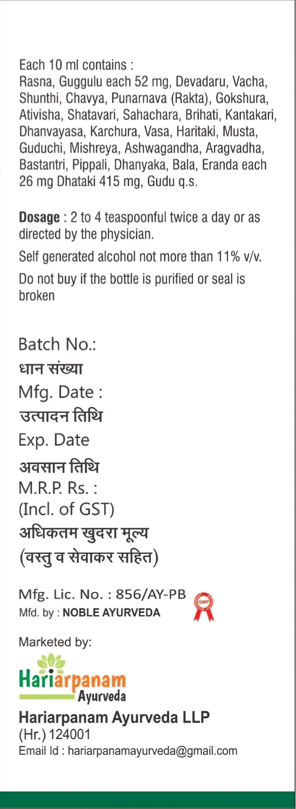 Rasna, Guggulu, Devadaru, Vacha, Shunthi, Chavya, Punarnava (Rakta), Gokshura, Ativisha, Shatavari, Sahachara, Bruhati, Kantakari, Dhanvayasa, Karchoora, Vasa, Haritaki, Musta, Guduchi, Mishreya, Ashvagandha, Aragvadha, Bastantri, Pippali, Dhanyaka, Bala, Eranda, Dhataki, Guda