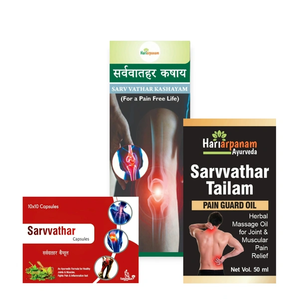 Hariarpanam's sarvvathar Kit is specially curated for your natural joint pain relief. It comprises the best of Hariarpanam pain-relieving products- sarvvathar Ayurvedic tailam 60ml, sarvvathar Ayurvedic Capsules, sarvvathar kashayam. All these sarvvathar Joint Pain-Relieving products are made up of natural herbs that help in relieving pain naturally and prevent joint stiffness and numbness.