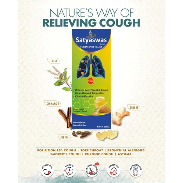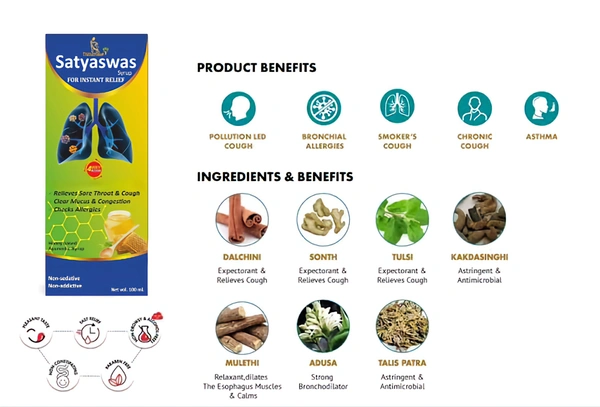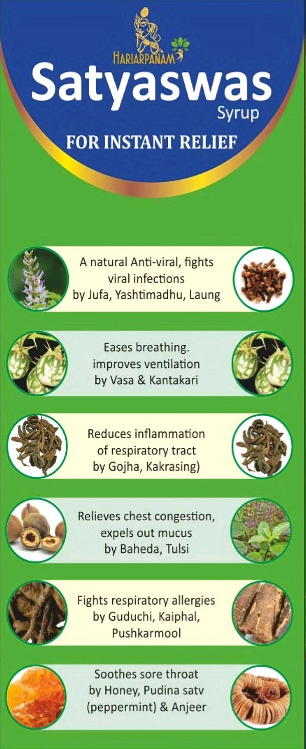 SATYASWAS SYRUP a herbal-mix formulation to combat respiratory tract infections of viral origin. It helps relieve childhood bronchitis and chronic bronchitis. It enhances bio-availability in antibiotic-resistant individuals by promoting rapid absorption from G.I.T and exerts potent pharmacological action to strengthen respiratory functions. The syrup is non-sedative and non-addictive.